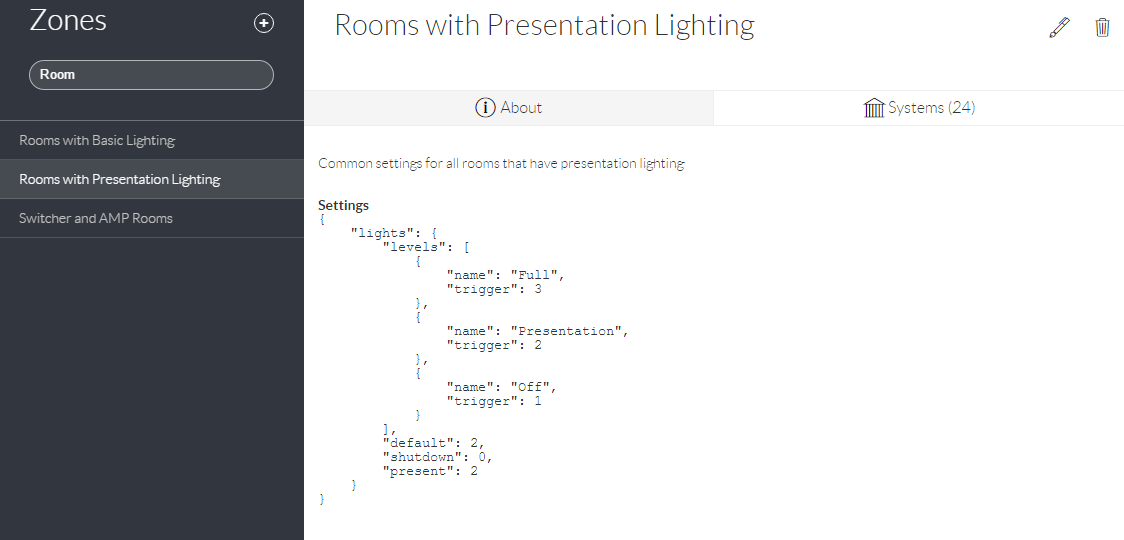 The Zones Section presents a searchable list of all defined Zones. Selecting a Zone will list that Zone’s Description, Settings (inherited by all Systems in that Zone) and Systems. New Zones can be added by clicking the + icon.